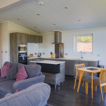 The striking, vibrant open plan living area is a blend of modern and traditional design, equipped with the latest technology. Relax in front of your 50” flat screen smart TV, or enjoy the superfast WiFi and wireless Sonos sound system. Cook up a storm in the fully equipped kitchen. It boasts a deep plum colour scheme to emphasise the lodge’s glamour and warmth.